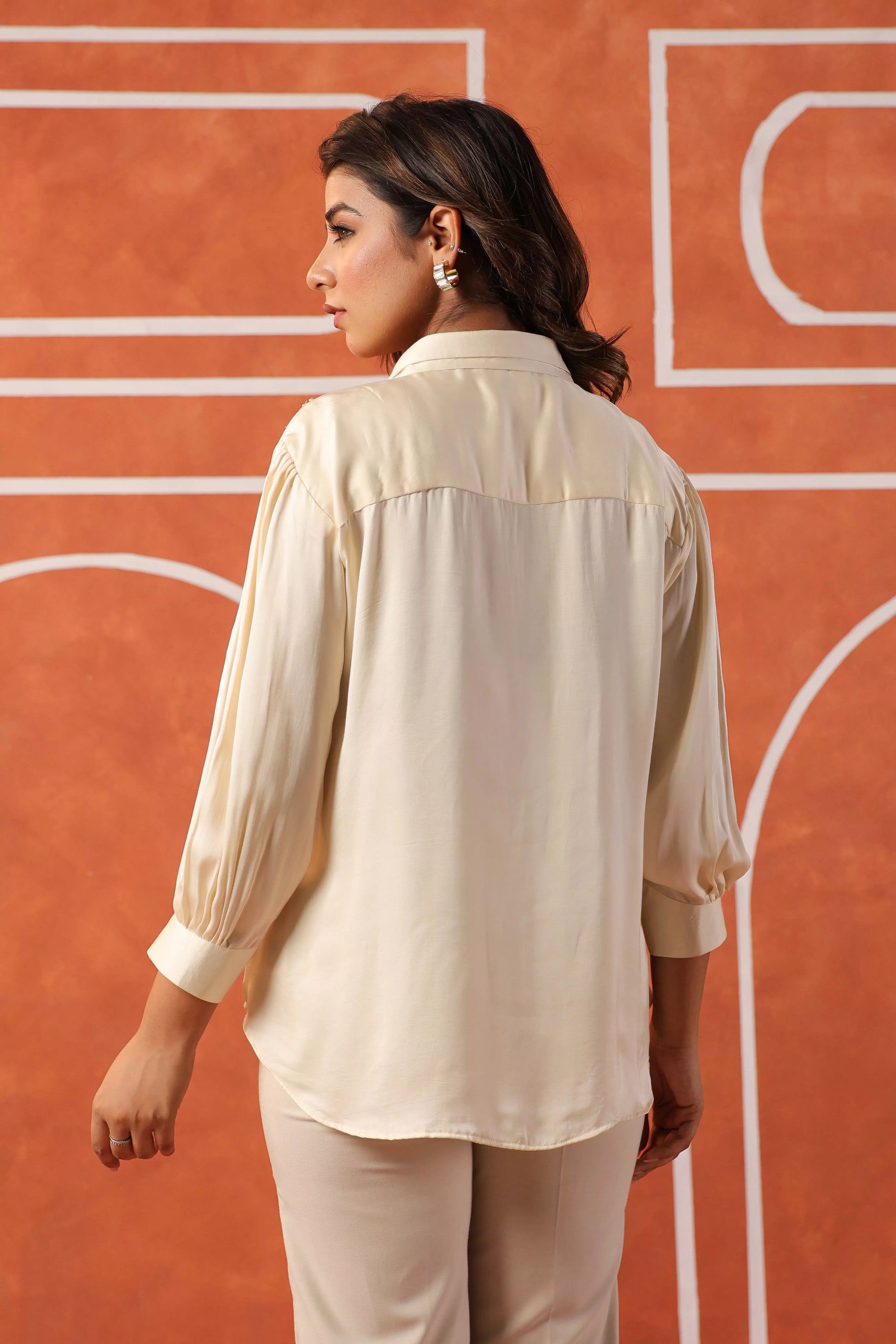Elevate every occasion with the Cream Satin Shirt—luxuriously hand-embroidered in sequins and beads for a refined statement of elegance.