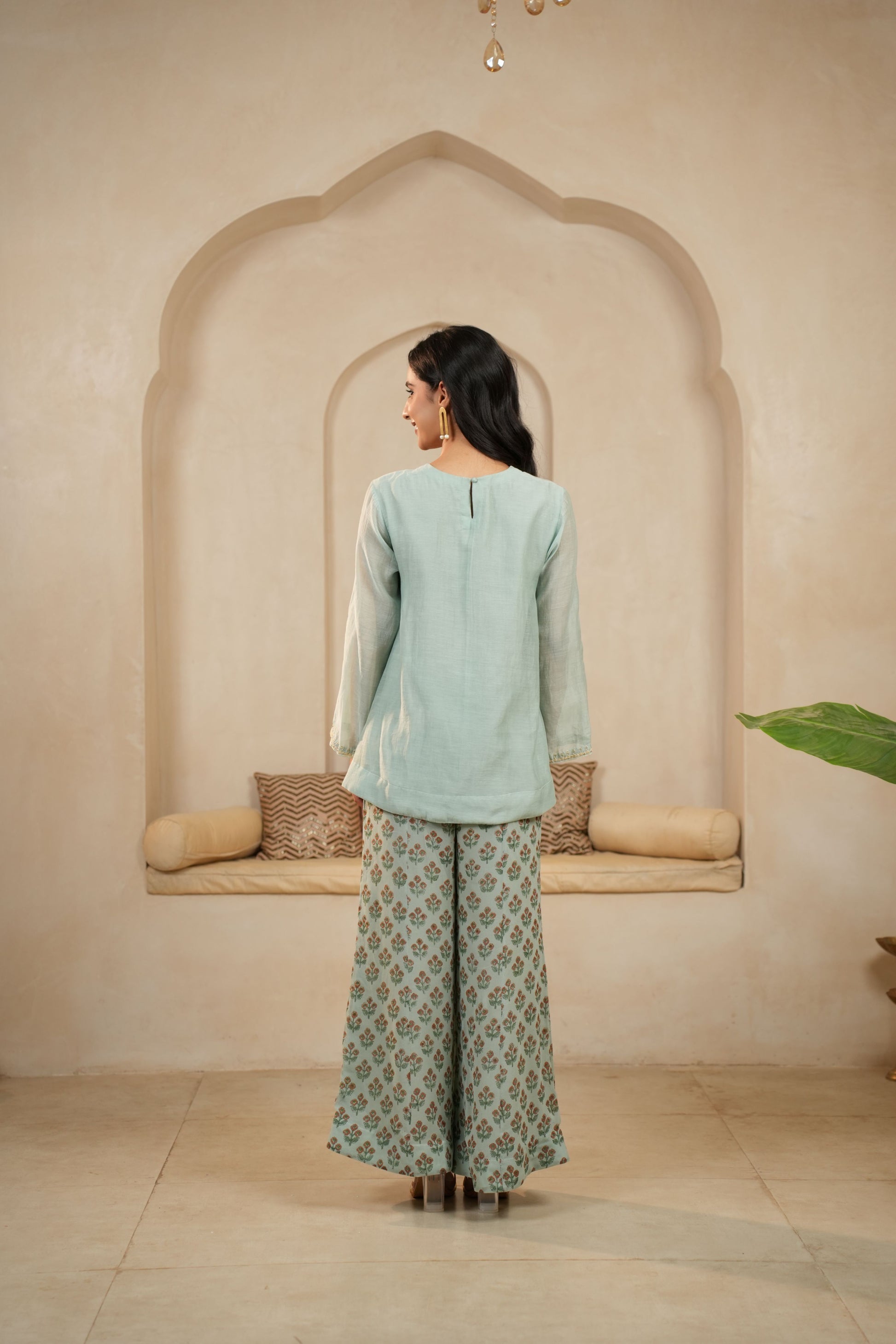 - Paired with hand-block printed georgette pants for an effortlessly elegant silhouette