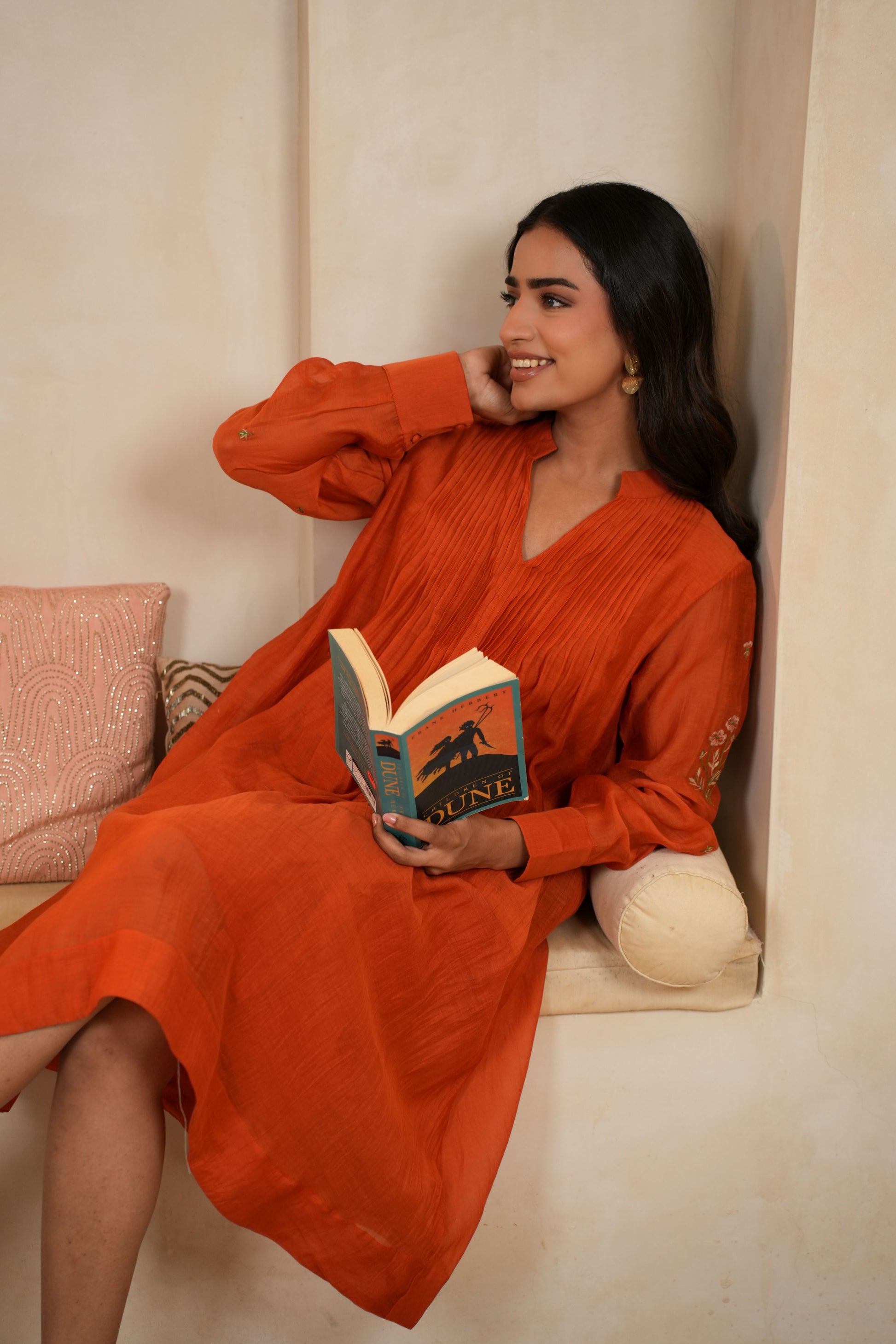 Rust Embroidered Chanderi Dress- A vibrant statement of timeless elegance.